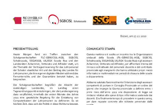 Dopo la mancata intesa contrattuale, il 17 dicembre si è svolto un incontro tra tutti i sindacati e il presidente della provincia con gli assessori alla scuola. La parte politica si è impegnata per la ripresa delle contrattazioni e propone soluzioni legislative immediate. Informazioni più dettagliate nel comunicato stampa unitario.