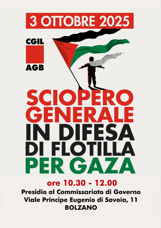 3 ottobre 2025 10:30-12:00 Presidio al Commissariato del Governo, Viale Principe Eugenio 11, Bolzano