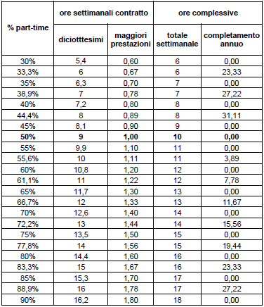 Ad esempio, con un contratto di 15 ore (trattamento economico 15 diciottesimi) le maggiori prestazioni da svolgersi settimanalmente sono pari a 15 diciottesimi di 2 = 15 x 0,111 = 1,67. L’orario settimanale comprensivo delle maggiori prestazioni è di 15 x 1,111=16,67 unità orarie, in pratica 16 ore alla settimana più ulteriori 23,33 ore (23 ore e 20 minuti) annue di completamento .