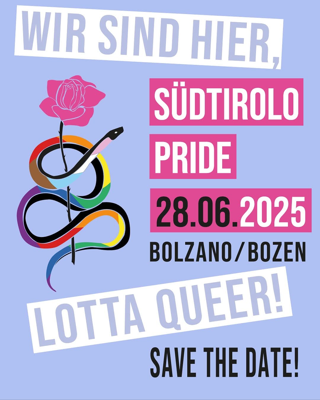 Im Laufe des Vormittags erreichten uns diese Flyer, mit Informationen bezüglich der 1. Südtiroler Pride, mit der Bitte, sie mit unseren Mitgliedern zu teilen. Wenn es euch interessiert, könnt ihr gerne teilnehmen :-) Auch um ein kleines Zeichen der Solidarität zu setzen, in Zeiten wo diese scheinbar immer mehr in den Hintergrund gedrängt wird.