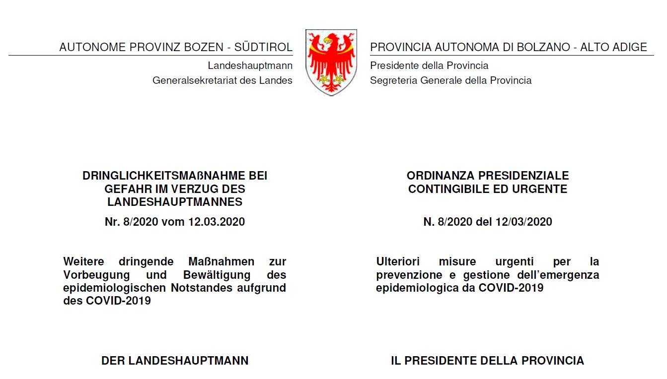 In Umsetzung der staatlichen Notstandverordnung des 11 Märzes 2020 hat der Landeshauptman die Dringlichkeitsmaßnahme Nr.8 vom 12 März 2020 unterzeichnet. Diese Verordnung sieht neue einschränkende Maßnahmen im Hinblick auf den Coronavirus Notstand vor. Für die Verordnung siehe hier.