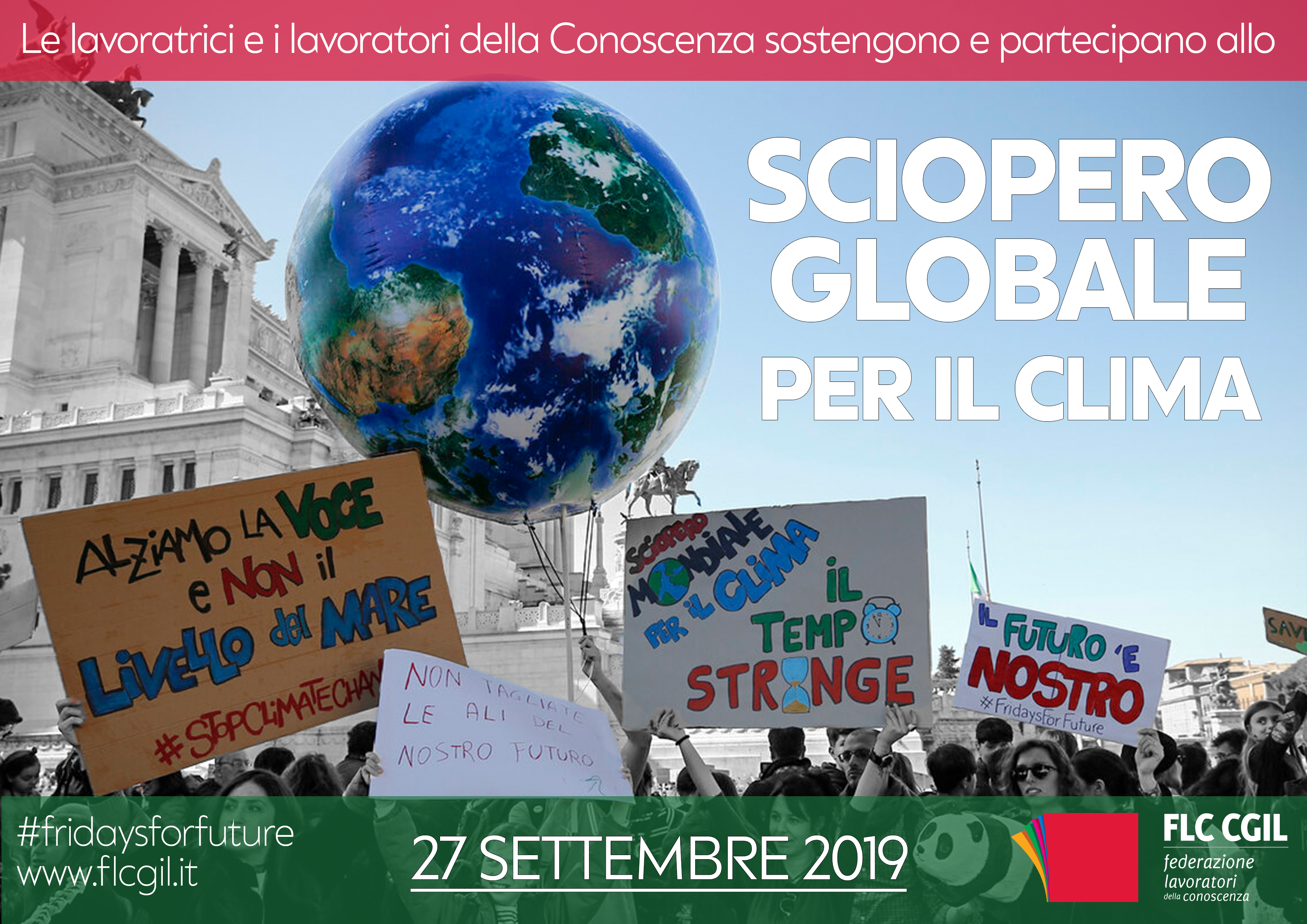 Am 27. September findet als Höhepunkt der Climate Action Week, eine Woche die den Thematiken des Klimawandels gewidmet ist, der dritte Global Climate Strike statt. Die GBW AGB, welche bereits im März die Initiativen der Studenten im Zusammenhang mit Fridays for Future unterstützt hat, ruft für den ganzen Tag des 27. Septembers zum Streik des gesamten Personals der Abteilung Bildung und Forschung, der Schulführungskräfte, der Universitätsprofessoren und des Lehrpersonals der Berufsschulen sowie aller gleichgestellten Schulen auf. Mehr Infos und die Flyer findet ihr auf der Homepage der FLC CGIL.