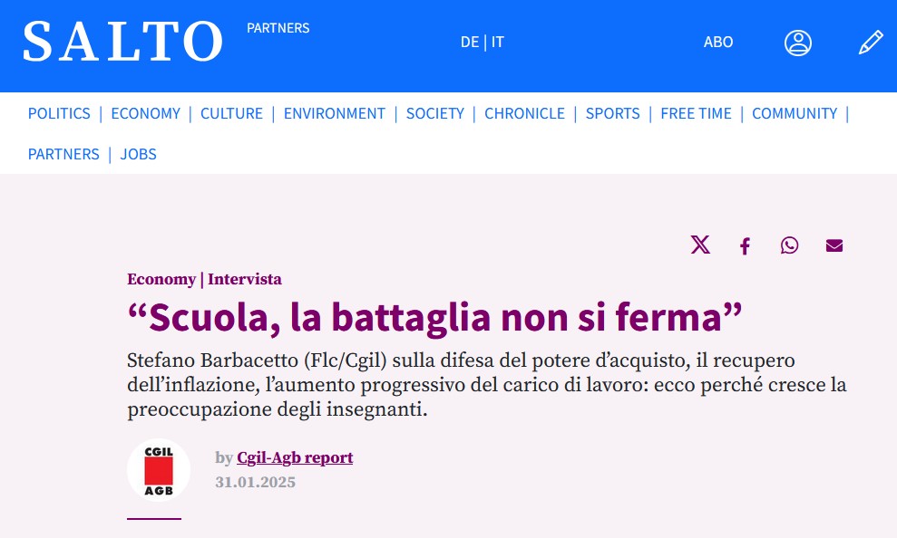 Inflation, Verhandlungen auf Landesebene und die kontinuierliche und schleichende Erhöhung der Arbeitslast für LP: dies sind die Themen im Interview in italienischer Sprache mit dem Landessekretär S. Barbacetto der FLC GBW von salto.bz vom 31.01.2025 - hier zur Web-Seite von salto.bz: sito web di salto.bz.